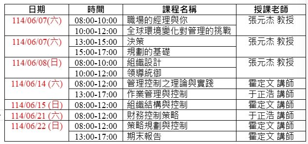 本課程屬於管理學院大學部之基礎課程,除了講解一般的管理理論與思想外,也將介紹近代的管理趨勢。管理主要是因應組織提高效率,提高競爭力而產生。不僅是工作職場之工具、方法、技術,亦是一種生活應用及思考方式。而身處今日「知識經濟」時代,如何善用有限資源,提昇個人及組織效率及競爭力之重要課題,已成為重要之課題。本課程之目標在教授管理學院學生,修習基本之管理概念及知識,擴展其學習及知識領域,培養其學習管理之興趣,並為其日後進一步修習管理各相關領域知識奠基。主要內容包含管理理論與分析方法之介紹與解說、規劃之內容與步驟、組織之內涵、領導模式、控制類型與方法、電子化對組織理論與管理之衝擊、知識經濟之組織管理議題。期能以宏觀面來瞭解透過管理來提昇企業競爭力之重要性,並探討全球市場運籌下,台灣企業的管理之道及經營策略。