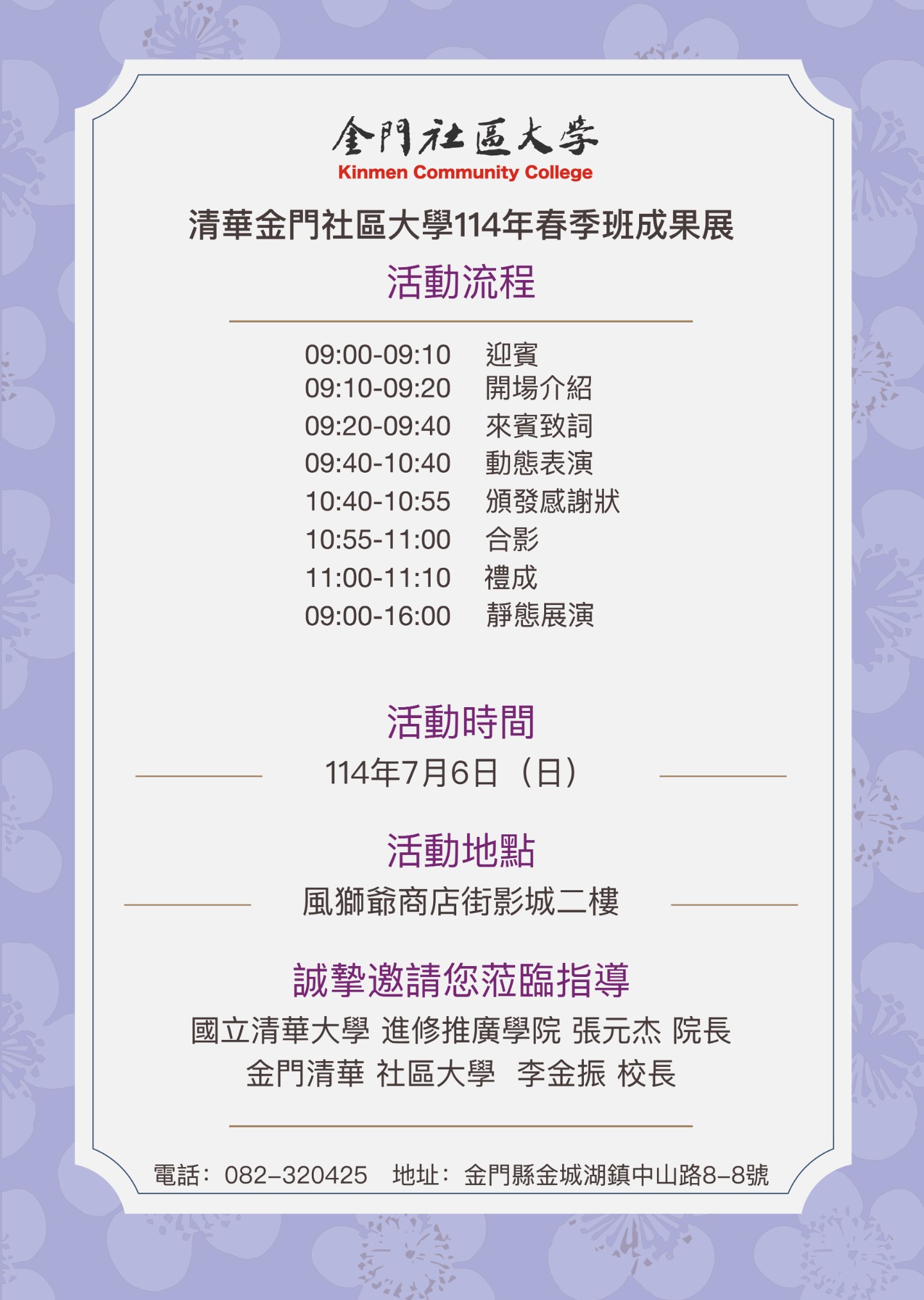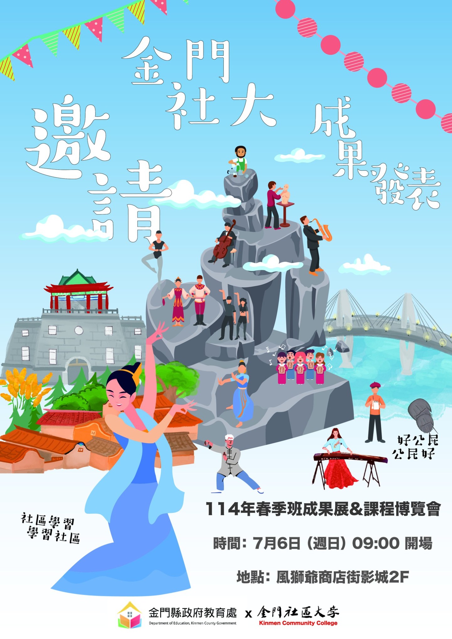 為展現學員們在本學期的精彩學習成果,金門社區大學將於 7月6日(星期日) 盛大舉辦 「114春季班成果展暨課程博覽會」。現場將呈現各類課程的豐碩成果與多元風貌,邀請您一同感受社區學習的熱情與生命力。